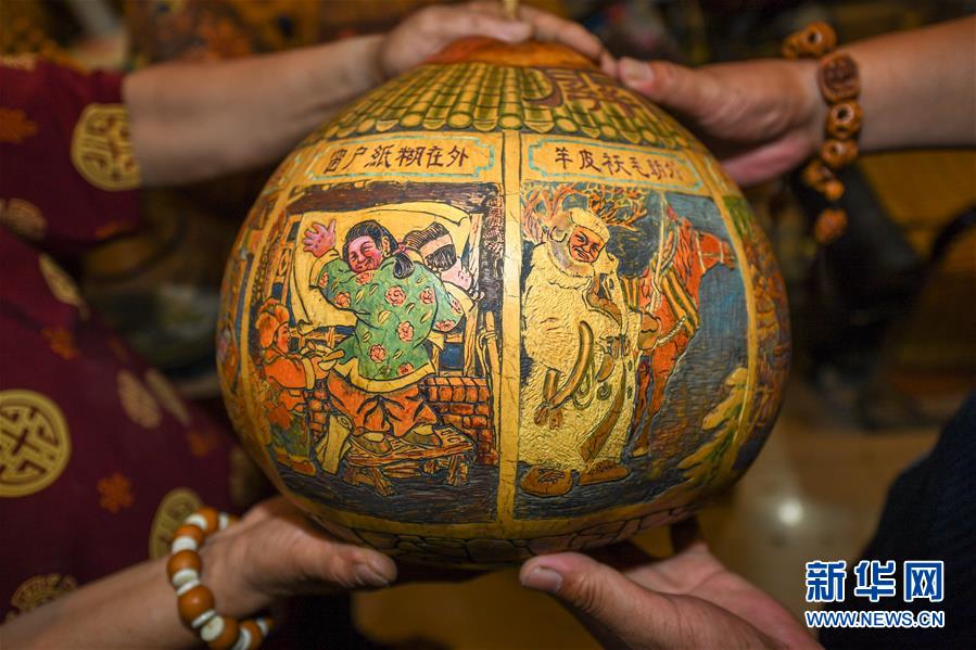 這是侯景偉創(chuàng)作的民俗主題葫蘆工藝品(8月5日攝)。 今年55歲的吉林四平人侯景偉自幼與家人學(xué)習(xí)雕刻、烙畫藝術(shù)。經(jīng)過多年潛心研究,他將浮雕和烙畫工藝相結(jié)合,通過拋光、起稿、雕刻、烙燙、套色等十余道工藝,制作展現(xiàn)傳統(tǒng)文化、民俗故事的葫蘆工藝品。2020年,侯景偉被評為四平市非物質(zhì)文化遺產(chǎn)項目侯氏葫蘆雕刻烙畫代表性傳承人。他說:“希望有更多人加入到非遺傳承隊伍中,讓小葫蘆‘講’出更多民俗故事。” 新華社記者 張楠 攝
