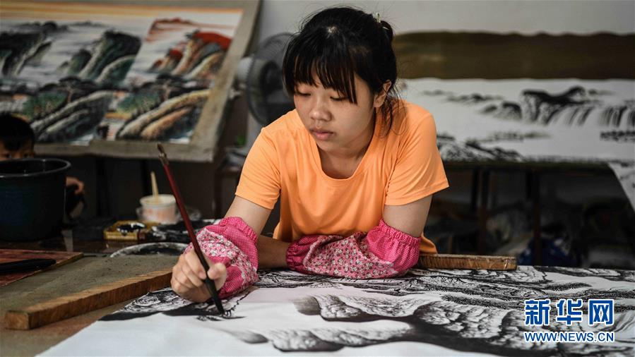 8月6日,在桂林市臨桂區(qū)五通鎮(zhèn),一名畫師在自己的工作室里創(chuàng)作。 近年來,廣西桂林市臨桂區(qū)五通鎮(zhèn)以“公司+貧困戶+畫師”的模式,大力推動(dòng)“農(nóng)民畫”產(chǎn)業(yè)發(fā)展。目前,五通鎮(zhèn)“農(nóng)民畫”從業(yè)者已達(dá)5000多人,“農(nóng)民畫”已成為當(dāng)?shù)剞r(nóng)民增收的新產(chǎn)業(yè)。 新華社記者 張愛林 攝
