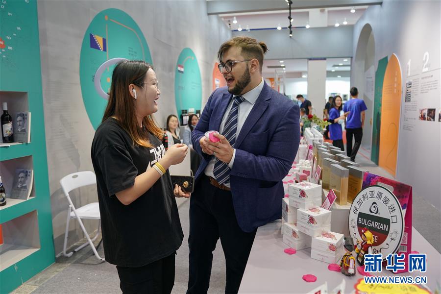 9月25日,來自索非亞中國文化中心主題館的外語主持人高偉義(右)在向游客介紹中東歐特色產(chǎn)品。 2020海絲之路(中國·寧波)文化和旅游博覽會于9月25日-27日在寧波國際會展中心舉行,吸引了“一帶一路”沿線多個國家和地區(qū)參展。 新華社記者 殷曉圣 攝