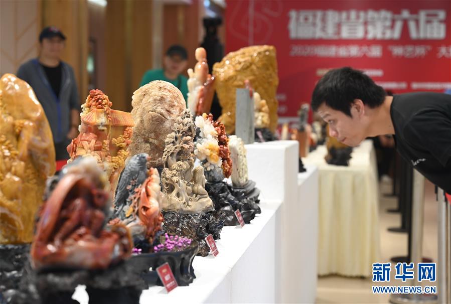 10月11日,觀眾在福建省第六屆“神藝杯”大賽作品展覽現場參觀。 當日,福建省第六屆“神藝杯”大賽暨中國“天工獎”入圍作品征集展在福建省工藝美術大樓舉行,展出作品涵蓋壽山石雕、玉雕、印石篆刻等多個類目。 新華社記者 林善傳 攝