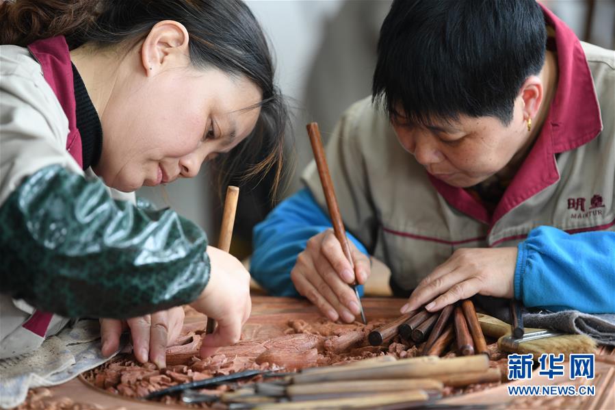 工作人員在浙江省工藝美術大師張向榮創立的明堂紅木家具雕花車間內雕刻作品(10月20日攝)。 新華社記者 翁忻旸 攝