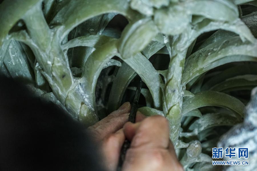 石雕師在中國(guó)工藝美術(shù)大師徐偉軍的工作室內(nèi)雕刻一件青田石雕作品(11月5日攝)。新華社記者 徐昱 攝