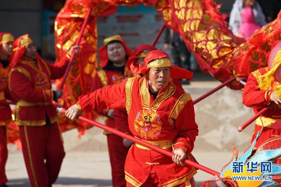 在山西省靈丘縣岸底村,村民們在排練舞龍節目(2月25日攝)。新華社記者 詹彥 攝