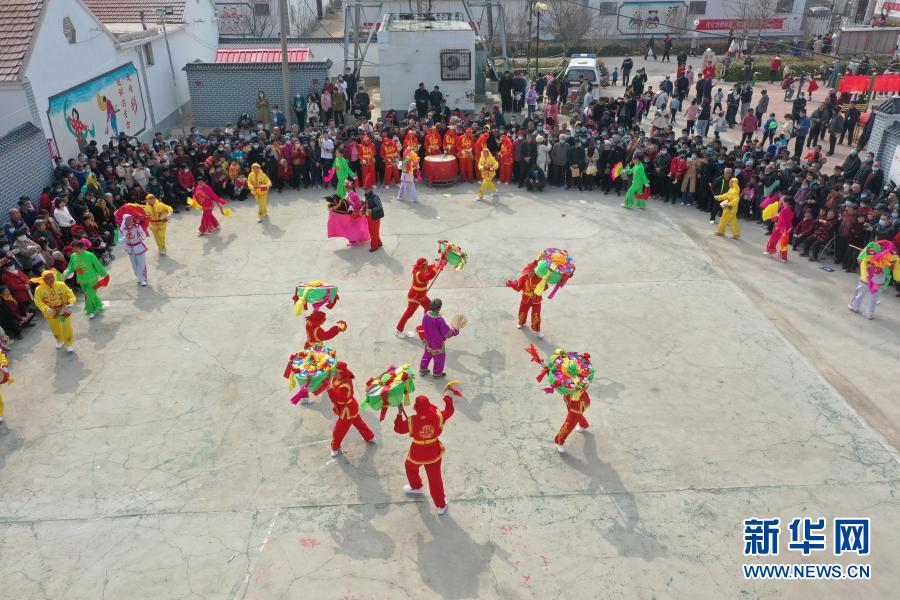 3月14日,秧歌隊員在山東省惠民縣皂戶李鎮表演?;菝窨h泥塑歷史悠久,農歷二月初二有捏泥塑、跑秧歌的傳統。
