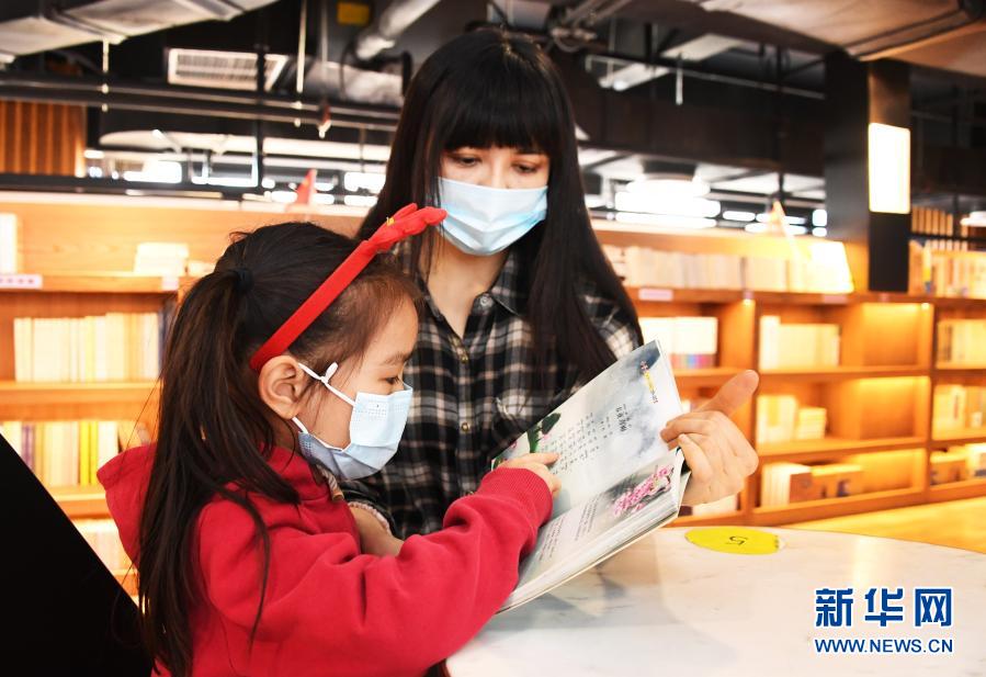 3月21日,在北京外研書店東升科技園店,一名小朋友與家長讀古詩。
