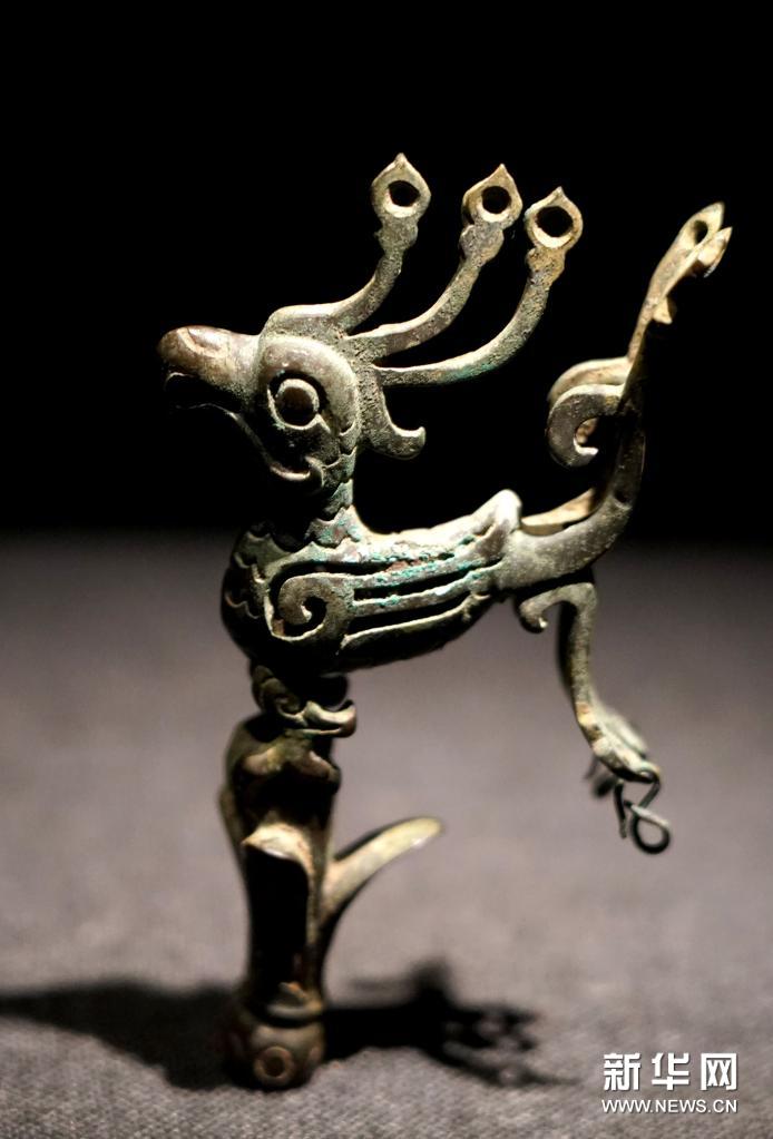 6月7日在奉賢博物館展廳拍攝的四川廣漢三星堆博物館藏文物“銅神樹枝頭花蕾及立鳥”。新華社記者 任瓏 攝