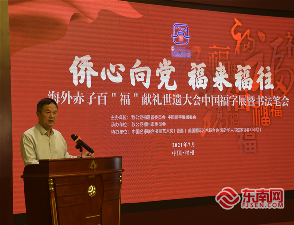 中國福字展組委會(huì)主任、美國福建聯(lián)合總會(huì)榮譽(yù)主席李貴明致辭 中國福字展組委會(huì)主任、美國福建聯(lián)合總會(huì)榮譽(yù)主席李貴明代表海外僑領(lǐng)致辭。他表示,海外赤子有責(zé)任讓福州的文化和自然遺產(chǎn)走得更遠(yuǎn),推動(dòng)包括書畫藝術(shù)在內(nèi)的中華優(yōu)秀傳統(tǒng)文化“走出去”,促進(jìn)福建與世界各國在文化藝術(shù)領(lǐng)域的廣泛交流與合作,進(jìn)一步促進(jìn)民心相通,為構(gòu)建人類命運(yùn)共同體貢獻(xiàn)僑界力量。 據(jù)了解,此次活動(dòng)共邀請(qǐng)了44個(gè)國家的僑胞藝術(shù)家創(chuàng)作了300多幅“福”字作品,并精心挑選100幅作品進(jìn)行展示,目的是以慶祝世遺大會(huì)的召開為契機(jī),以“福”文化為載體,引導(dǎo)海外僑領(lǐng)向世界闡釋推介具有中國特色、體現(xiàn)中國精神、蘊(yùn)藏中國智慧的優(yōu)秀傳統(tǒng)文化,進(jìn)一步提升中華文化在海外傳播的影響力、感召力,展示豐富多彩、生動(dòng)立體的中國形象。 活動(dòng)期間,書法家們以書寫“福”字形式,為河南受災(zāi)群眾祈福。
