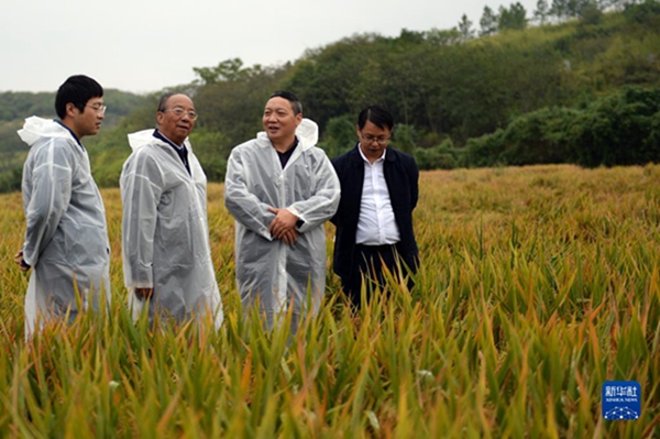 10月17日,測產(chǎn)專家組組長、中國科學院院士謝華安(左二)在測產(chǎn)現(xiàn)場查看水稻生長情況。新華社記者 陳振海 攝
