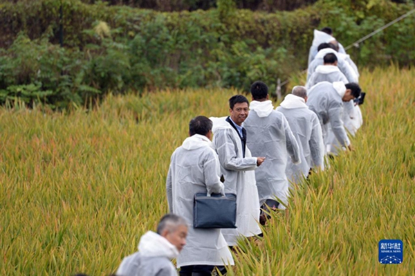 10月17日,測產組工作人員在測產現場查看水稻生長情況。新華社記者 陳振海 攝