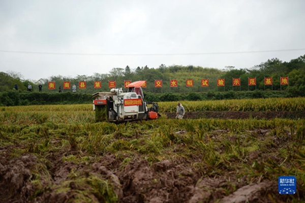 10月17日,工作人員在測產現場進行機械化收割。新華社記者 陳振海 攝