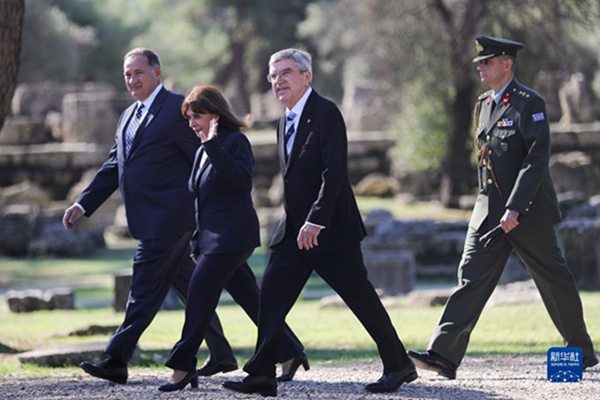 10月18日,希臘總統(tǒng)卡特里娜·薩克拉羅普盧(左二)、國(guó)際奧委會(huì)主席托馬斯·巴赫(左三)、希臘奧委會(huì)主席斯皮羅斯·卡普拉洛斯(左一)抵達(dá)古奧林匹亞遺址出席北京冬奧會(huì)火種采集儀式。
