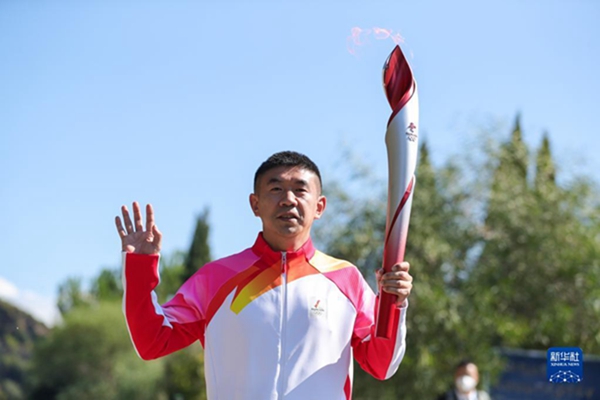 10月18日,第二名火炬手——前中國短道速滑運動員李佳軍手持北京冬奧會火炬“飛揚”在火種采集成功后傳遞。